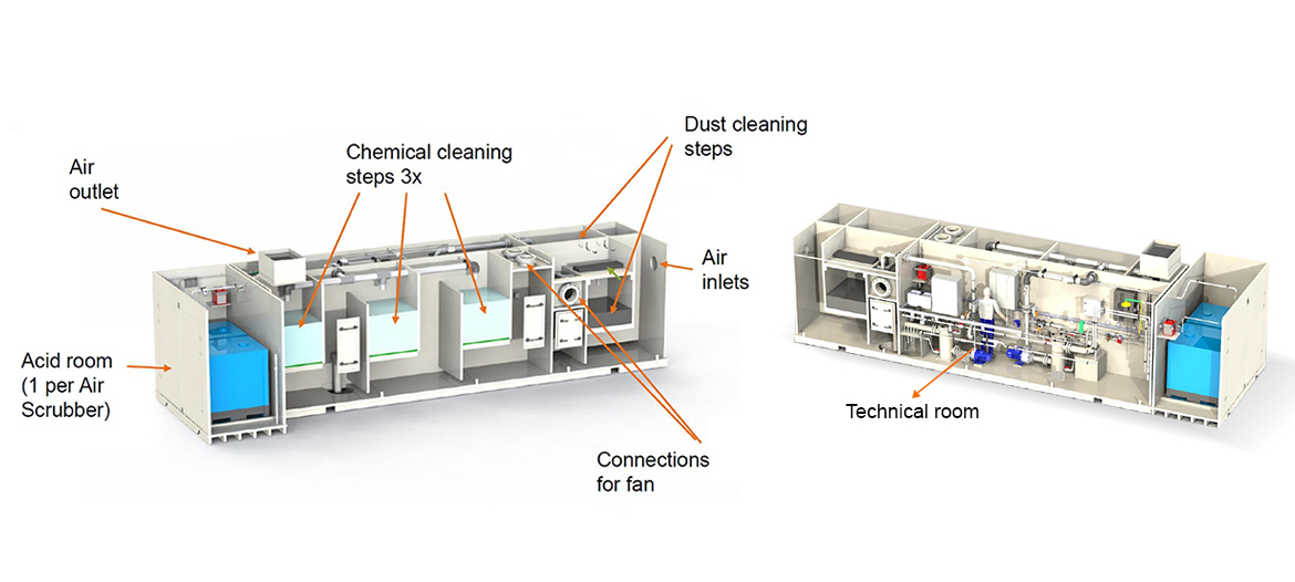 Developed for Big Dutchman’s CompoTower composting concept, the CompoTower Air Scrubber module is a prerequisite for locations having high emissions due to the composting processes. Prefabricated in a plastic housing, the scrubber’s well-dimensioned body ensures the cleaning of exhaust air from two CompoTower systems using a single module. It is fitted with a technical room, acid container, acid pump, safety provisions, and an emergency shower. All the technical parts are mounted in the technical room.