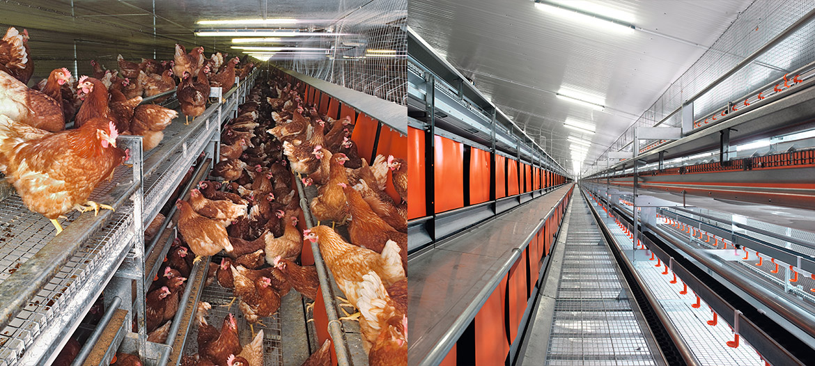 - Allows the birds to make short jumps between the functional areas for resting, eating, drinking and egg laying, due to the stepped design